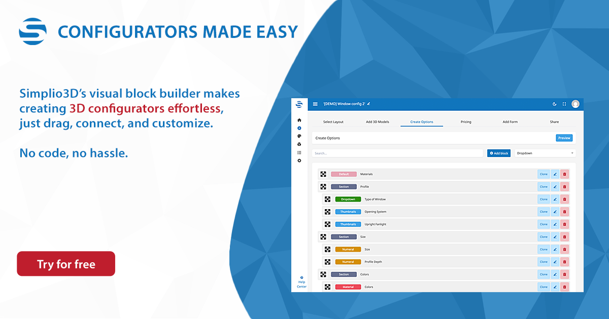 Simplio3D is designed around a flexible “block” approach to configuration. In the app, you can build option sets using multiple block types (including Dropdown, Material, Checkbox, Toggle, Thumbnails, Upload, Text, Numeral, Patterns, and Canvas), then connect them with conditional logic (restrictions) to show/hide valid choices and guide users to compatible configurations.
